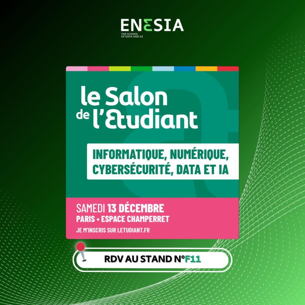 ENESIA, l’école de la Data et de l’IA à Paris, vous donne rendez-vous ce samedi au Salon de l’Étudiant dédié à l’informatique, au numérique, à la cybersécurité, à la data et à l’intelligence artificielle.